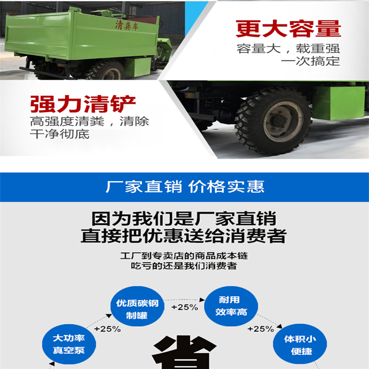 其他小区也经常出现化粪池堵塞现象,目前环卫部门已经注意到这种现象,正在加紧采购各种吸粪车缓解疏通。吸污吸粪车安装进口防溢流装置,防止粪便污水因吸满倒灌至真空泵。罐体龟背式设计,不变形。吸粪导物管可度,排放采用自排和压力排放,安装浮球液位控制器。本公司生产的吸粪车可自吸自排,抽吸方便,具有真空度高吸程远的特点,可不同用户在不同的中使用。吸污吸粪车可根据客户要求加装清洗功能,水粪罐可分仓,即可吸粪又可清洗,一车两用。清粪干净刮粪车 四轮式驴粪铲粪车 环保型清粪车